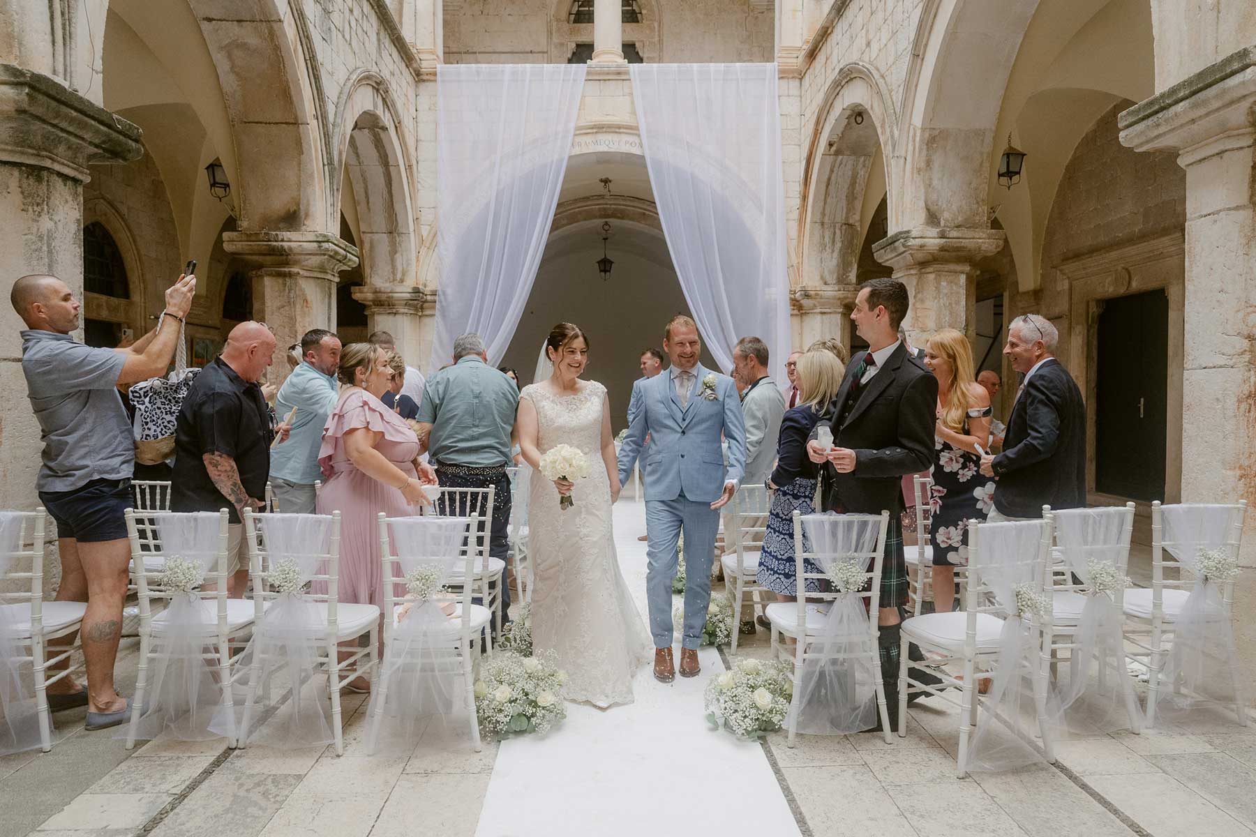 Dubrovnik destination wedding planner, Sponza Palace grand expit of bride and groom with confetti